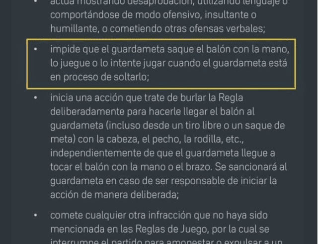 «El tiro libre indirecto se ejecuta si un jugador impide que el guardameta saque el balón con la mano, lo juegue o lo intente jugar cuando el guardameta está en proceso de soltarlo», remarcaron en la publicación.