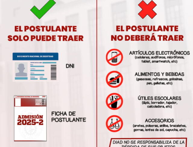 Objetos permitidos y prohibidos para el examen de admisión 2025-2. Foto: DIAD-UNI